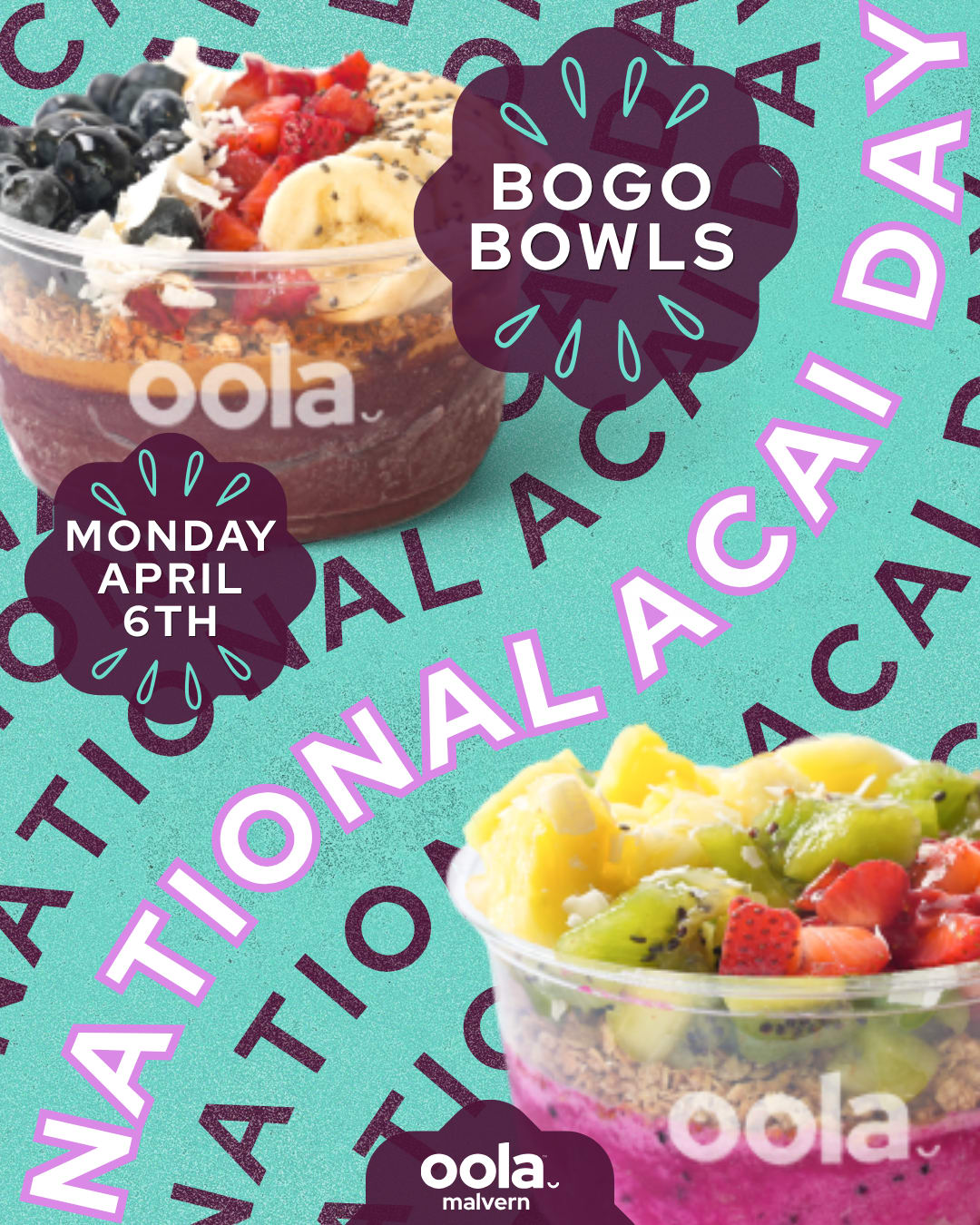 To celebrate National Acai Day - bowls will be buy one, get one FREE on Monday, April 6th at Oola Bowls Malvern!